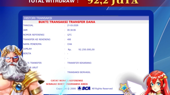 Bukti transfer yang dapat anda lihat adalah bukti SAH / VALID yang langsung di dapatkan melalui bukti transaksi dari Bank yang digunakan untuk pengiriman dana pada rekening pemilik user id. Terima kasih kami sampaikan kepada para pengguna setia BOLAGILA yang telah menggunakan situs kami, sebagai Bandar no account casino uk Terpercaya yang pastinya membayar semua kemenangan member hingga lunas. Apakah BOLAGILA PENIPU ? Reputasi “BOLAGILA TERPERCAYA” sudah sangat melekat.