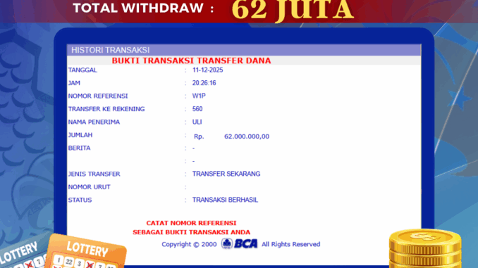 MEMBER BOLAGILA MENERIMA PELUNASAN KEMENANGAN JACKPOT TOGEL DI ASIA PACIFIC 4D Rp 62.000.000,- LUNAS