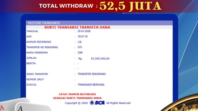 Bukti transfer yang dapat anda lihat adalah bukti SAH / VALID yang langsung di dapatkan melalui bukti transaksi dari Bank yang digunakan untuk pengiriman dana pada rekening pemilik user id. Terima kasih kami sampaikan kepada para pengguna setia BOLAGILA yang telah menggunakan situs kami, sebagai Bandar Terpercaya yang pastinya membayar semua kemenangan member hingga lunas. Apakah BOLAGILA PENIPU ? Reputasi “BOLAGILA TERPERCAYA” sudah sangat melekat.